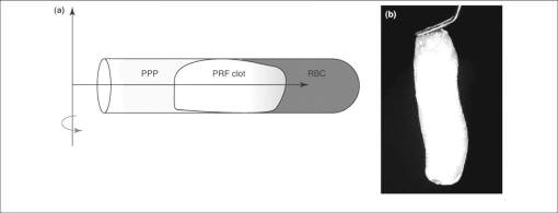 Slika 2. Po protokolu po Choukrounu se kri takoj po odvzemu centrifugira (14 minut, 1500 obr/min) brez antikoagulantov in koagulacija se hitro začne. Kri se razdeli v tri sloje. Zgornji je plazma brez trombocitov (PPP, platelet poor plasma), v spodnjem pa so eritrociti (RBC). Srednji sloj je čvrst in v njemu so ujeti trombociti in levkociti skupaj s proteini kot so rastni faktorji in fibronektin (4).