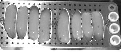 Slika 3. Iz vsake epruvete dobimo čvrsto fibrinsko mrežo, ki jo nato med dvema slojema stisnemo v čvrste membrane, ki jih je mogoče tudi šivati na tkiva. V dnu posode se nabere tekočina, ki tudi vsebuje celice, proteine in rastne faktorje in se jo uporabi za mešanje s kostnimi nadomestki in kolagenskimi membranami.