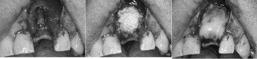 Slika 4. Kostni nadomestek (ksenograft) premešamo s tekočino, ki se nabere po stiskanju PRF matriksa v membrane, da dobimo zmes, ki lažje zadrži obliko. S PRF membranami prekrijemo presadek. Kadar je poškodovan oziroma prerezan periost, preko PRF membran namestimo tudi kolagenske resorbilne mebrane.