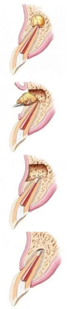 Apikotomija je poseg, kjer kirurško odstranimo vnetno tkivo ali morda celo cisto ob vršku korenine mrtvega zoba. Zob mora biti pred našim posegom ustrezno zdravljen – torej mora biti koreninski kanal zoba tesno zapoljnjen z zdravilom. Da bi se čimbolj učinkovito preprečilo možnost ponovitve vnetih težav in rasti vnetega tkiva, ob posegu potem, ko smo odrezali vršek obolelega zoba, napravimo še plombo na vršku korenine. To napravimo tako, da z ultrazvočno sondo pripravimo končni del kanala korenine in ga zatesnimo s plombo.